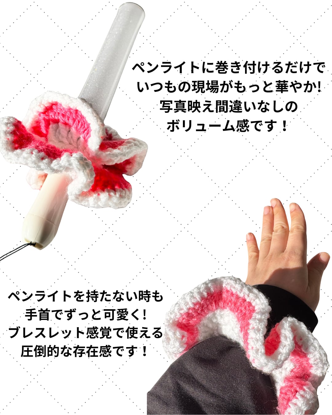 お手持ちのペンライトにくるっと巻き付けるだけで、いつもの現場がもっと華やかに!