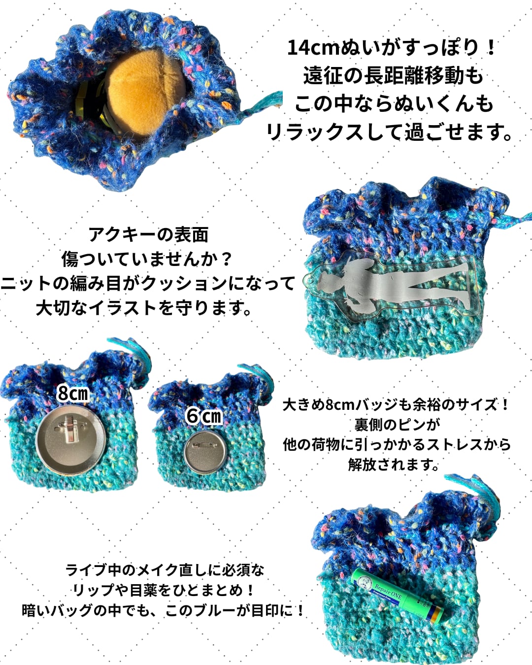 特徴: * 14cmぬい、アクキー、缶バッジ、リップ等に対応