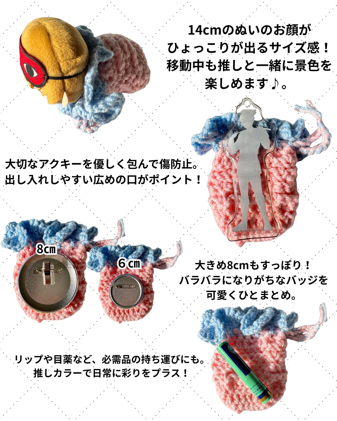 ・アクキー: 出し入れしやすい広めの口がポイント!表面の傷が気になるアクキーも、ニットの編み目がクッションになります。