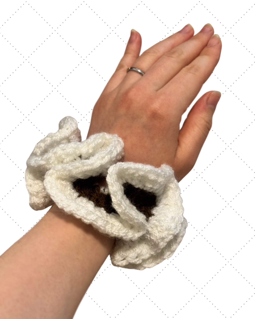 優しい手編みの質感: 毛糸ならではのふんわりとした柔らかさがあり、長時間つけていても疲れにくい仕様です。